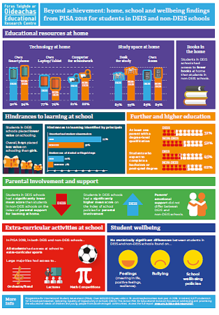 'Beyond Achievement: Home, school and wellbeing findings from PISA 2018 for students in DEIS and non-DEIS schools' is the latest report from the Educational Research centre examining the home and school learning environments of 15-year olds in DEIS and non-DEIS schools. The report provides a detailed examination of the home and backgrounds of students in DEIS and non-DEIS schools and examines broader issues including wellbeing, the value that students place on education, their motivation, and aspirations for future learning and employment.