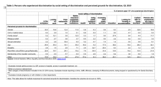 Table 1: Persons who experienced discrimination by social setting of discrimination and perceived grounds for discrimination, Q1 2019