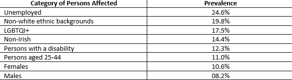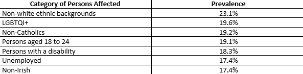 Despite being against the law, workplace discrimination was experienced predominantly by unemployed persons, people from non-white ethnic backgrounds, persons who identify as LGBTQI+, non-Irish and persons with a disability (Table 1).