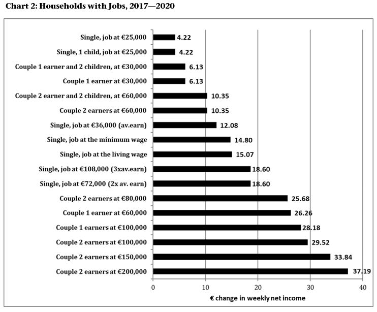Among households with jobs (see Chart 2), the net income gains experienced range from €4.22 per week (for a single worker on €25,000) to almost nine times as much, €37.19 per week, for a couple with 2 earners and an income of €200,000. Overall, across these households the main gains have flowed to those earning the highest incomes.