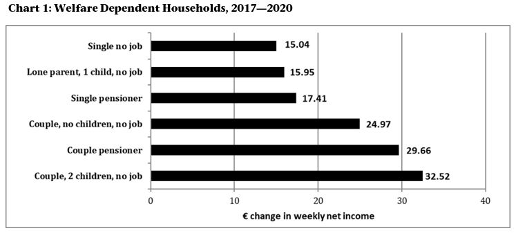 Among households dependent on welfare, the gains have ranged from €15.04 per week (to single unemployed) to €32.52 per week to unemployed couples with 2 children - see Chart 1. Over these three Budgets all household types recorded increases in their disposable income. However, it is single unemployed people and those on the lowest earnings who have gained least.