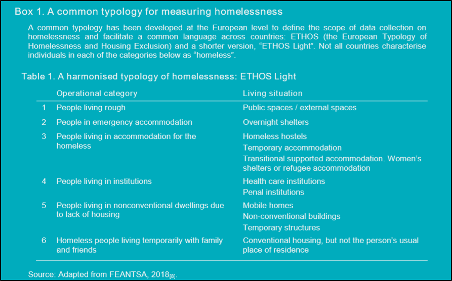 The ETHOS typology, developed at a European level, seeks to provide a composite definition of homelessness for the purposes of data collection. This typology (Box 1, taken from the OECD Policy Brief) would require an inter-Governmental approach to data collection on homelessness, requiring data from the HSE and Department of Health, and the Department of Justice and Equality, however much of this data should already exist within the various systems, or be possible with relatively small adaptations.