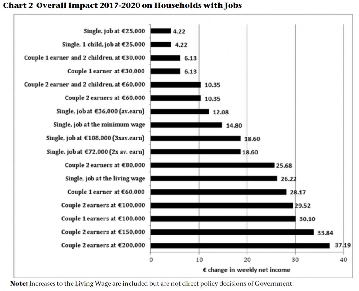 Over the years examined all household types record an increase in disposable income. Among households with jobs (see chart 2), the gains experienced range from €4.22 per week (for single workers on €25,000) to almost nine times as much, €37.19 per week, for a couple with two earners on €200,000. Overall, across these households the main gains have flowed to those on the highest incomes. In particular the chart highlights that low to middle income earners, those earning at or below €30,000 a year, are being left out – beneficiaries of neither welfare increases nor the income tax reductions which have, in general, favoured higher earners.
