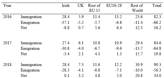 According to the CSO, emigration of Irish nationals continues to fall, decreasing from 49,700 in 2012, to 42,500 in 2015 and an estimated 28,300 in 2018. While there was a slight decrease in Irish nationals returning in 2017, 2018 saw a return to 2016 levels of immigration with 28,400 Irish emigrants returning. Decreasing emigration and increasing immigration indicates a renewed confidence in Ireland’s economic prospects. However, issues with housing and the sustainability of decent jobs, among others, call this fledgling confidence into question.