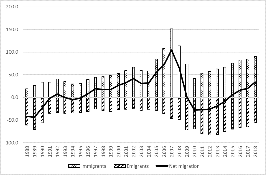 Chart 1 : Immigration, Emigration and Net Migration, ,000 people, 1988-2018
