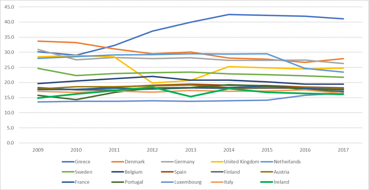 Chart 2: Distribution of population by tenure status, Tenant, market rent, EU-15 2009-2017
