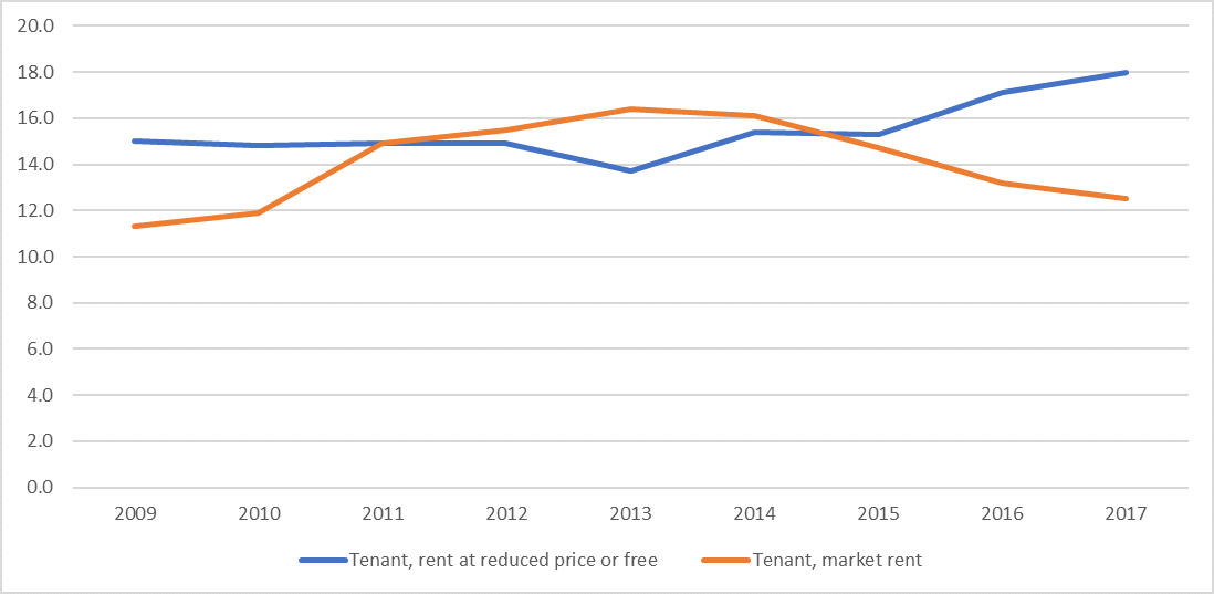 As can also be seen in Chart 2, this proportion increased between 2009 and 2013 before declining in subsequent years to 2017. There is a direct correlation between the distribution pattern of the proportion of the population ‘Tenant, market rent’ and that of ‘Tenant, rent at a reduced price or free’ (see Chart 3). As there has been no discernible increase in local authority rented accommodation, and subsidies such as the Housing Assistance Payment are discounted in the Eurostat dataset, it is likely that this indicates an increase in ‘couch surfing’ and those staying with family and friends.