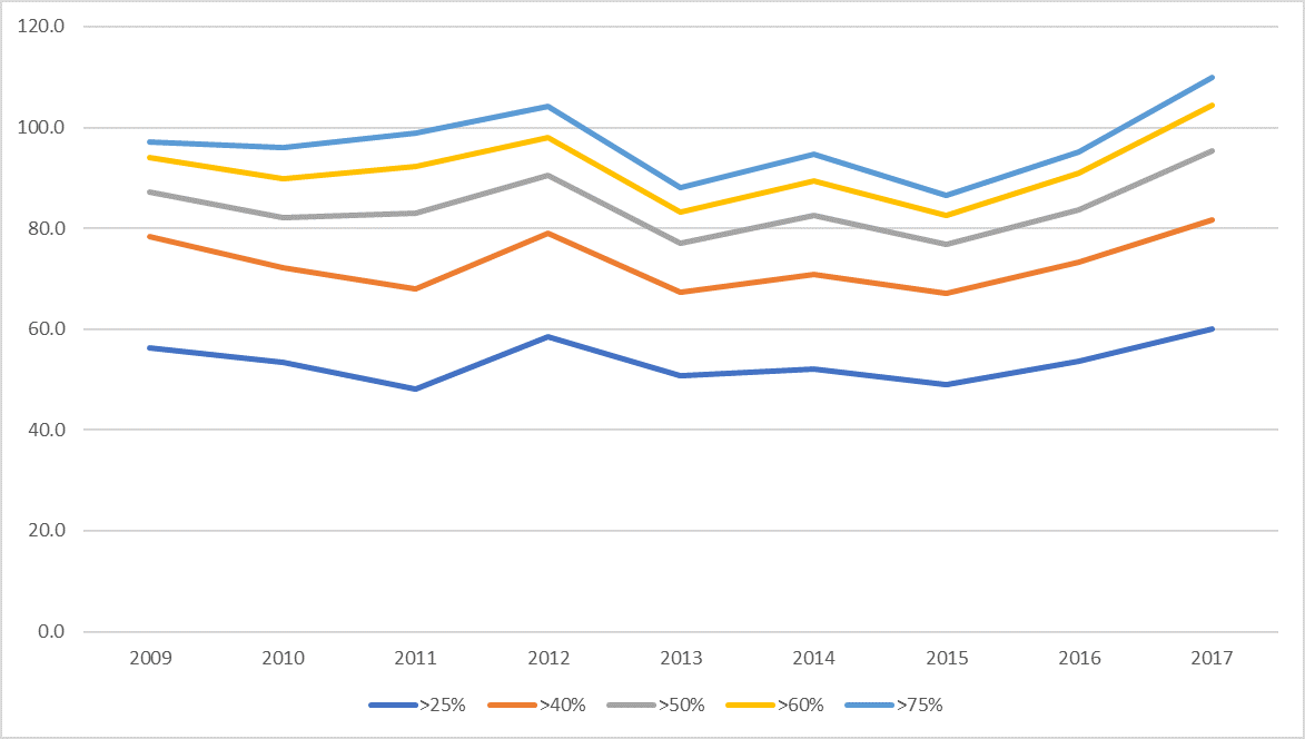There is also an inverse correlation between the distribution of the population ‘Tenant, market rent’ and the housing cost burden of this cohort at each of the indicator points listed by Eurostat, that is those paying more than 25%, 40%, 50%, 60% and 75% of their disposable income towards housing costs (Chart 4). Here you will see that the housing cost burden fluctuates between 2009 and 2014 before increasing steadily to 2017.