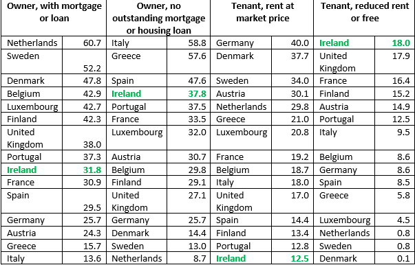 How is this possible at a time of persistent rent inflation and mortgage interest rates among the highest in the Eurozone? Unfortunately this particular dataset is not available by tenure (i.e. owner occupied / rented), but an analysis of related datasets does provide a clearer picture.