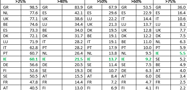 Ireland’s distribution of the population paying private rent is relatively low compared to our EU-15 counterparts (Chart 2).