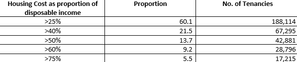 Almost 1 in 10 tenants, 28,796 tenancies, spent more than 60% of their disposable income on housing costs in 2017, with 1 in 20, 17,215 tenancies, spending over 75%. With an average of 2.1 occupants per tenancy (according to the RTB Annual Report), this equates to 141,320 people with a housing cost burden of more than 40%, of which 60,472 people have a housing cost burden of more than 60% and 34,430 have a housing cost burden of more than 75%. This is unsustainable.