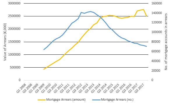 If long term sustainable solutions to mortgage arrears are not found, many more families will find themselves in need of social housing. There were 70,488 home mortgages in arrears at the end of 2017 with Central Bank regulated lenders, with 48,433 in arrears of more than 90 days.  While the number of mortgages in arrears has been decreasing for the past 17 consecutive quarters, the actual amount of arrears continued to rise, reaching a high of €2.76 billion in Q3 2017, before decreasing to €2.5 billion by the end of the year.