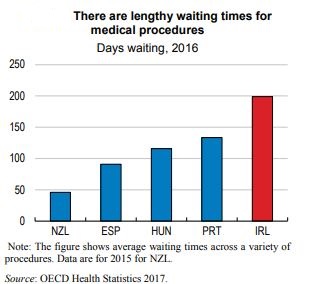 In its latest biannual report on Ireland, the think-tank noted that despite the continuing economic recovery, Ireland’s health system is ‘failing in terms of cost, patient satisfaction and waiting times’. (See chart below).