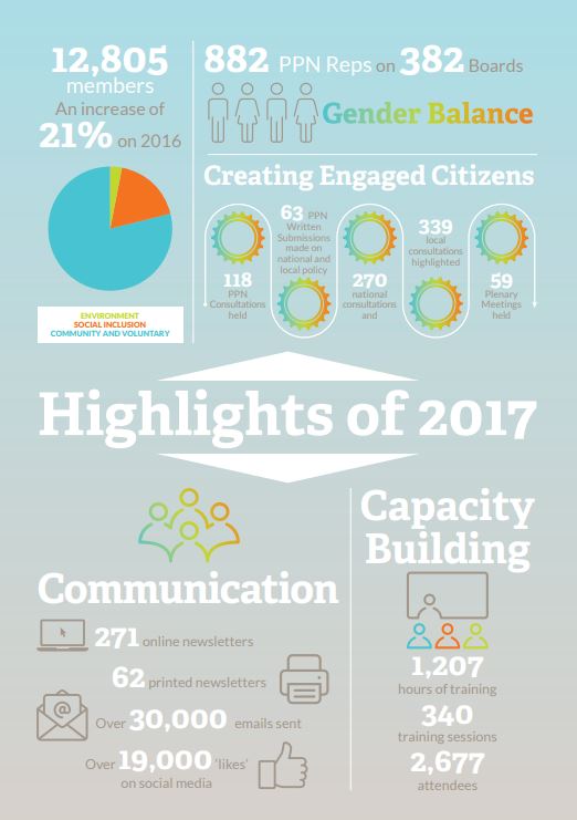 The Public Participation Network Annual Report 2017 published by the Department of Rural and Community Development shows the current state of PPNs. As of the end of 2017, PPNs across the country had grown to have a total of 12,805 member organisations, an increase on 2016 of 21 per cent.
