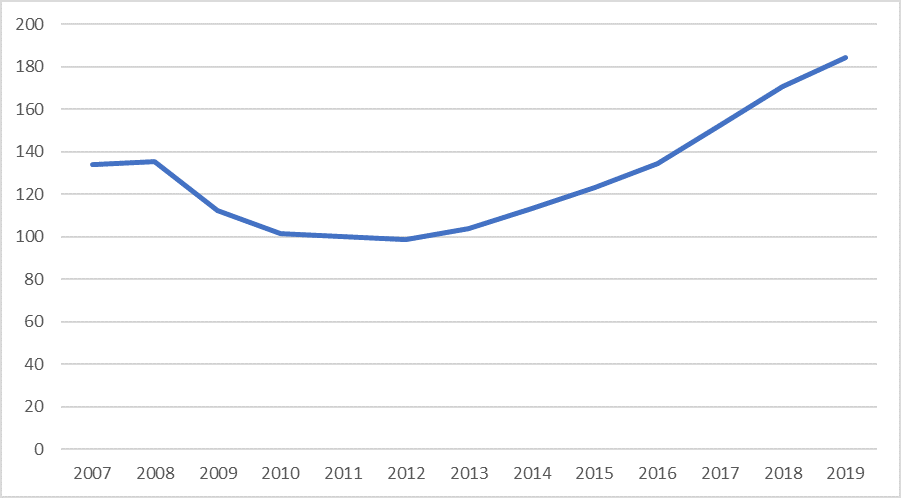 During this time, subsidies to the private rented sector in the form of Housing Assistance Payments (HAP) and Rental Accommodation Scheme (RAS) leases with Local Authorities have also increased. According to the Local Authority Budgets data published by the Department of Housing, Planning and Local Government, expenditure allocations in respect of RAS increased from €156.8 million in 2012 to €275.2 million in 2018, an increase of 75.5%. Expenditure allocations in respect of HAP (introduced in September 2014), meanwhile, increased from €10.6 million in 2015 to €423.4 million in 2018 – an increase of 3,894%.