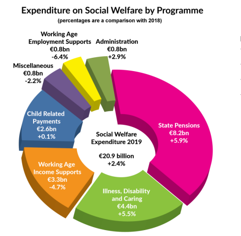 Of the €20.9 billion in social welfare expenditure in 2019, almost four in every ten euro was spent on Pensions (39.3 per cent); one in five was spent on payments in respect of Illness, Disability and Caring (21.3 per cent); Working Age Income Supports accounted for 15.6 per cent; Children accounted for 12.6 per cent; and Supplementary Payments and Working Age Employment Supports accounted for 3.8 and 3.7 per cent respectively (Chart 1).