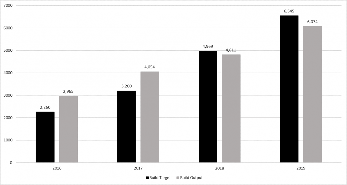 Chart 1: Social Housing Builds v Targets, 2016 to 2019