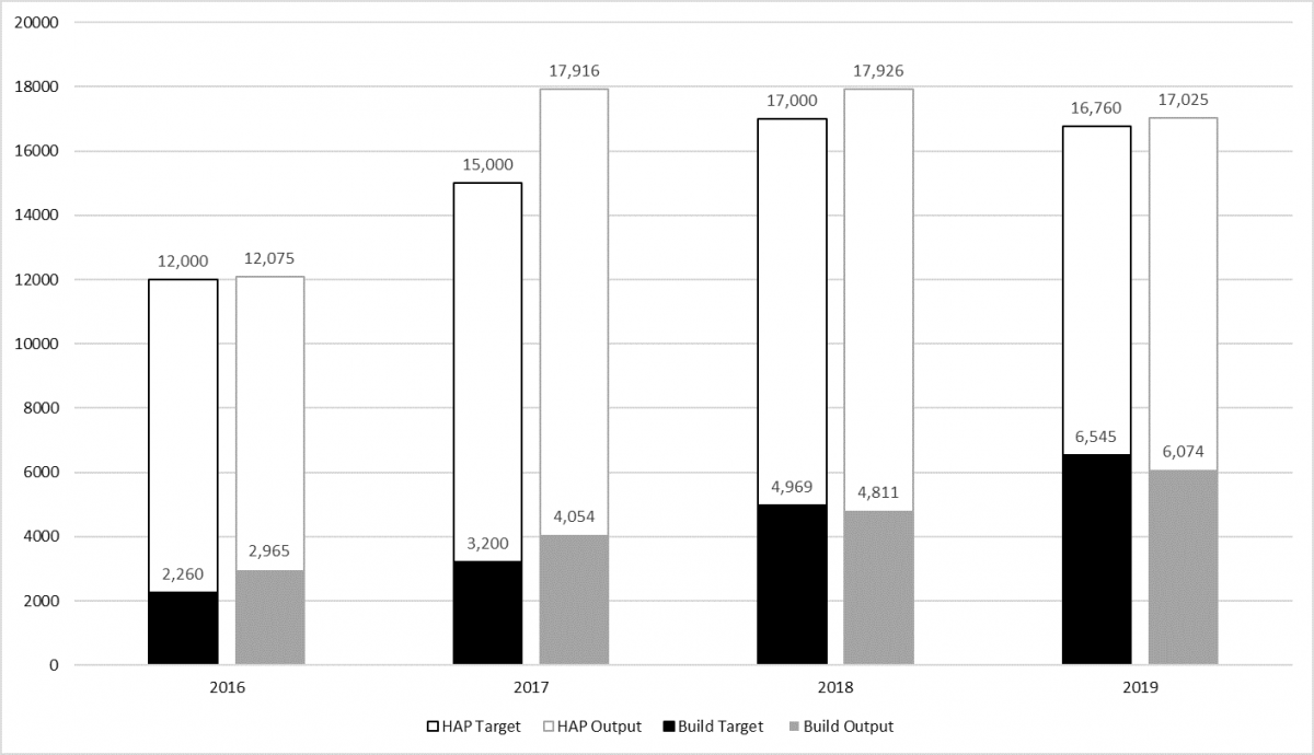 Chart 2: Social Housing (builds) and HAP, Targets v Output, 2016 to 2019